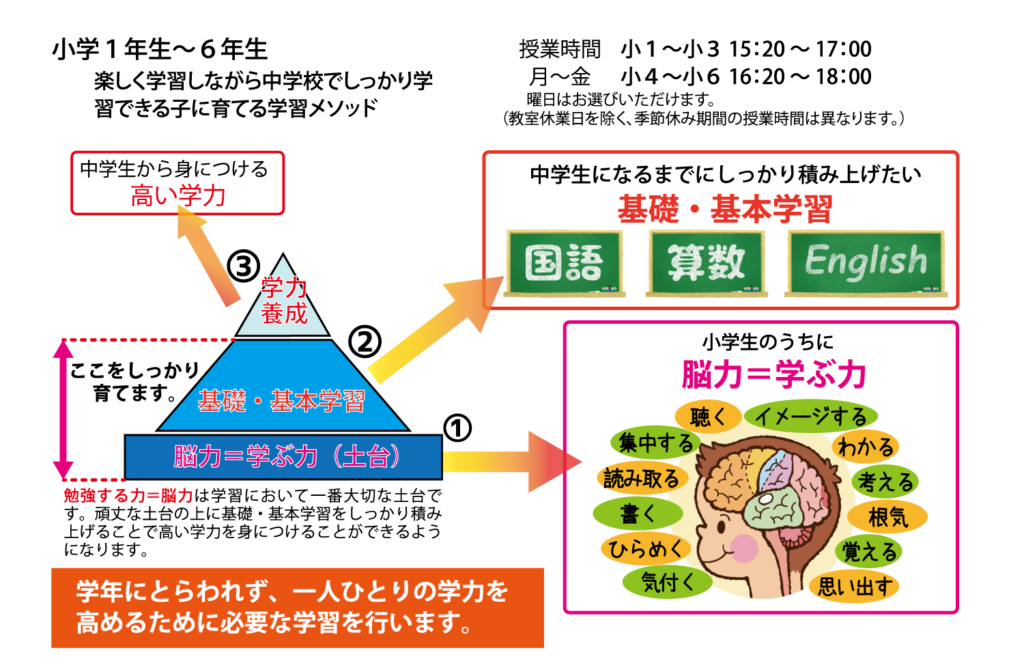小学校の低学年は勉強するのに必要な脳力を高める時期、高学年は中学生になるための準備期間と位置付けて学習指導を行います。中学校の学習に対応できる脳力と学力を確実に身につけられるよう国語と算数の基礎・基本をしっかり身につけ、高校入試や大学入試の英語4技能テストにも対応できるようネイティブティーチャーによる英語レッスンも行います。