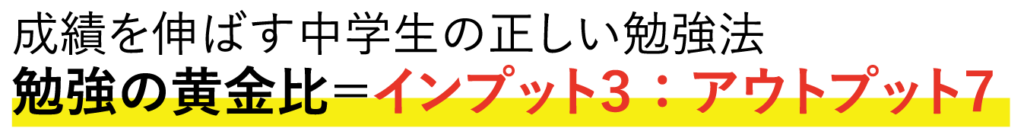 勉強することを2つに分類すると、教科書を読む、ポイントをノートにまとめる、公式や英単語などをを暗記する、といったインプットする勉強と練習問題を解く、覚えているか確認する、といったアウトプットの勉強があります。教育関係者ならだれでも知っているのがインプット3:アウトプット7の比率になるように勉強すると成績が格段に伸びるということ。これが勉強の黄金比。質の高い勉強はインプット3:アウトプット7を実践することで得られます。